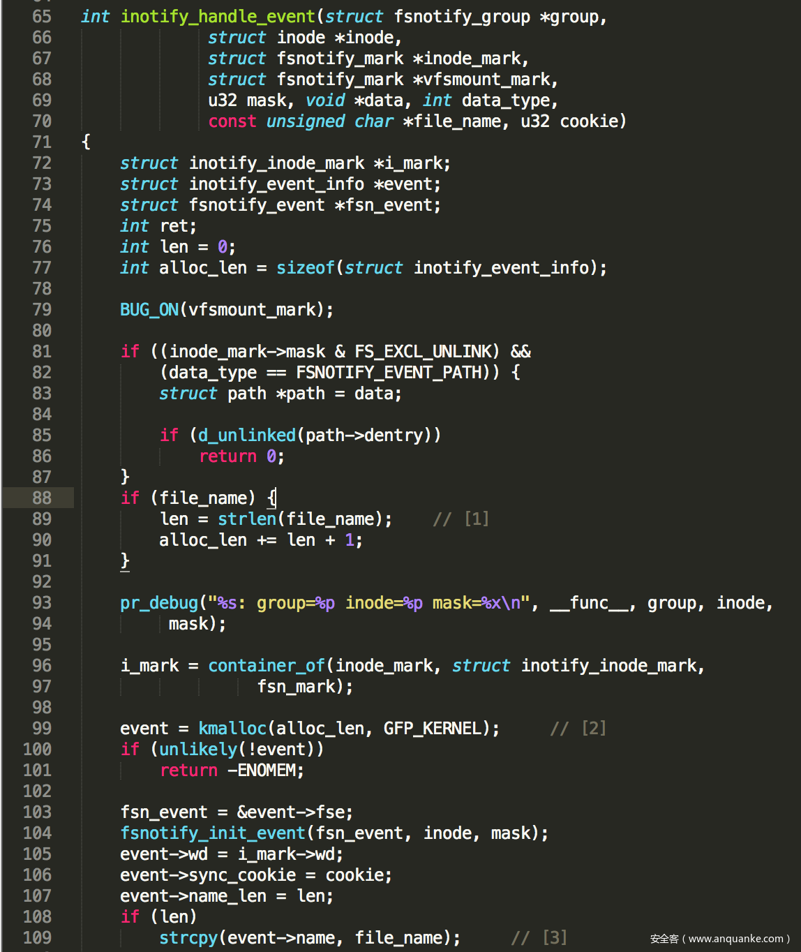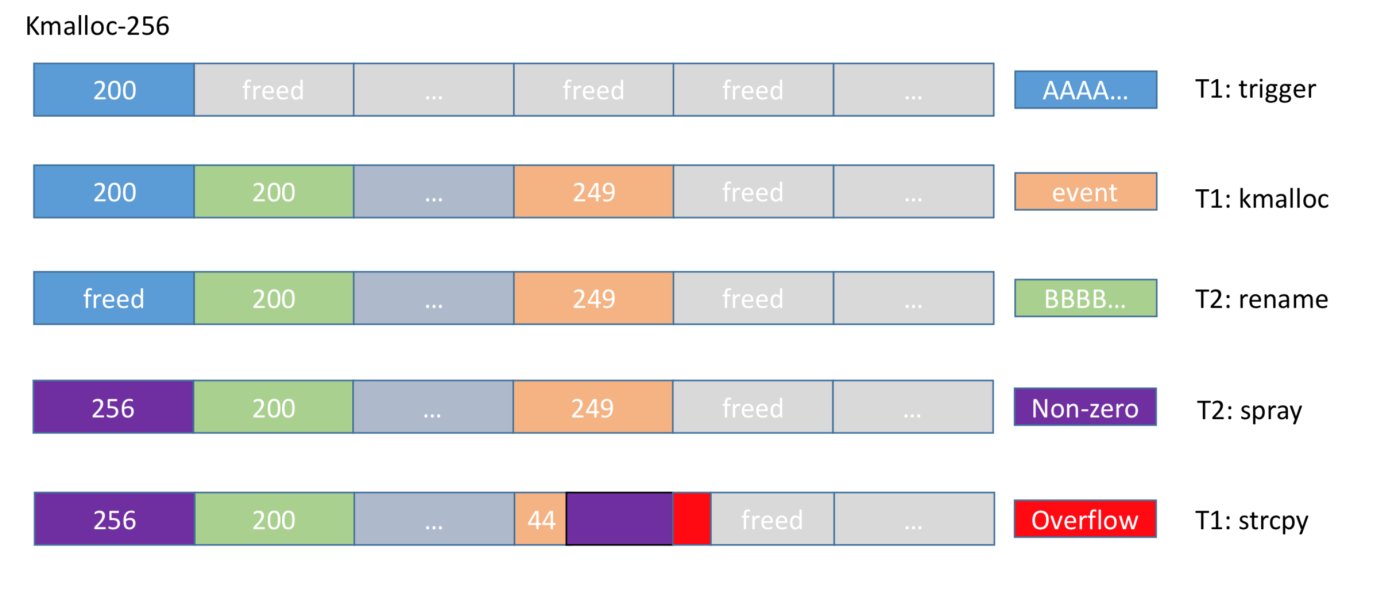 [1]处计算文件名的长度,并根据长度在[2]分配相应的存储buffer,在[3]拷贝文件名字符串。这个BUG在于,从[1]到[3]的代码路径上,此文件能够被重命名,导致[3]发生内核堆越界覆盖。