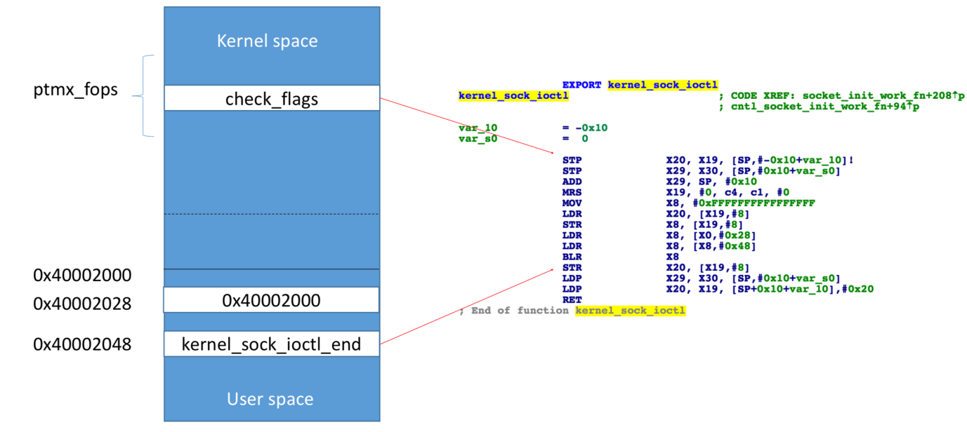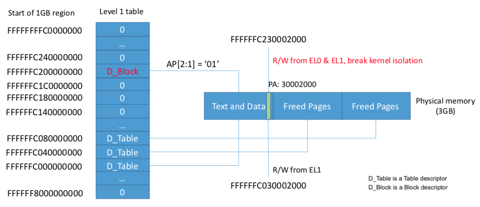 虽然多次触发上述条件竞争漏洞将payload数据写入内核可以用于绕过PAN,但exploit代码执行成功率急剧下降。另外,借助其他内核漏洞(eg: CVE-2017-13164)可以将数据稳定写入内核,但在漏洞急剧减少的情况下,能否通过新的利用技巧同时绕过PXN和PAN防御机制,并获取系统最高权限?借助ARM处理器的MMU硬件特性,答案是肯定的。