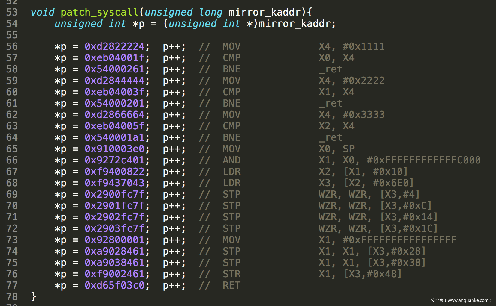 至此,上帝模式已经开启。攻击者可以运行如下的攻击代码。这段攻击代码直接修改内核数据,patch内核代码。而对于普通C开发程序员或者Linux内核开发人员来说,已经违背了现代操作系统的常识,绝对是无稽之谈。然而在上帝模式下,这段代码就能真实的运行。