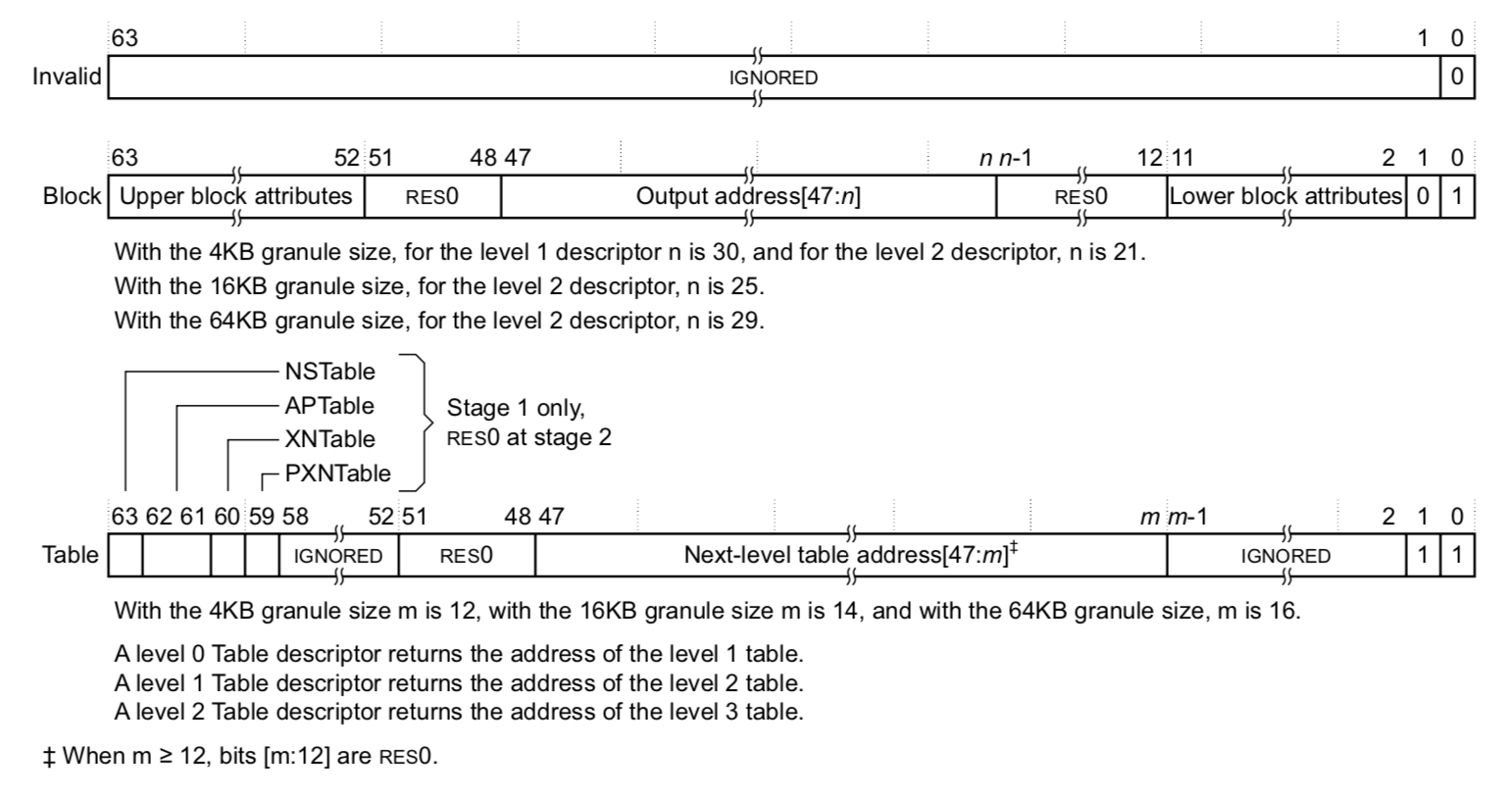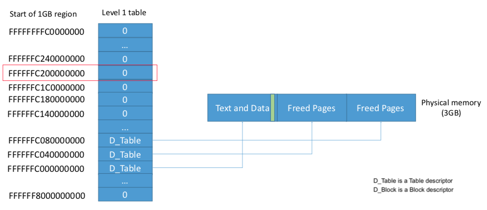 64位内核空间的虚拟地址绝大多数是无效的,比如”[0xFFFFFFC200000000, 0xFFFFFFC23FFFFFFF]”范围的地址都是无效的,其对应的一级页表项为空。假设此页表项不为空,存在一个BLOCK类型的页表项。其AP组合为’01’,output address指向第一块1GB的物理内存,如图所示。