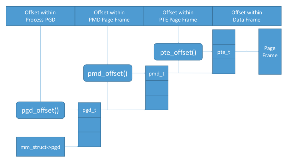 Linux内核经典的三级页表(PGDPMDPTE)布局和遍历关系如下图所示。