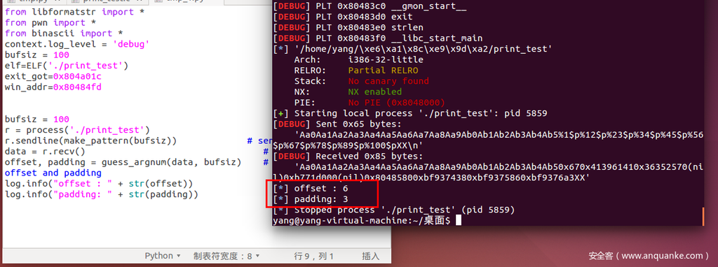 offset, padding = guess_argnum(data, bufsiz) # find format string offset and padding