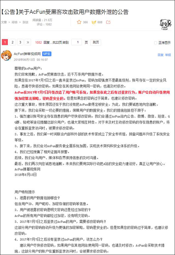 第一个是A站密码被盗。6月13日凌晨,AcFun弹幕视频网发布声明称,网站受黑客攻击,近千万条包含用户ID、用户昵称、加密存储的密码的用户信息外泄。虽然几十个小时后,窃取用户信息的黑客发布声明称,已无条件删除窃取的数据库,但陆续爆出其他平台用户数据泄露消息,依旧引发了人们对于个人信息泄露的恐慌(就在小象完成这篇稿件时,又传出某知名招聘网站195万信息泄露的消息….)。