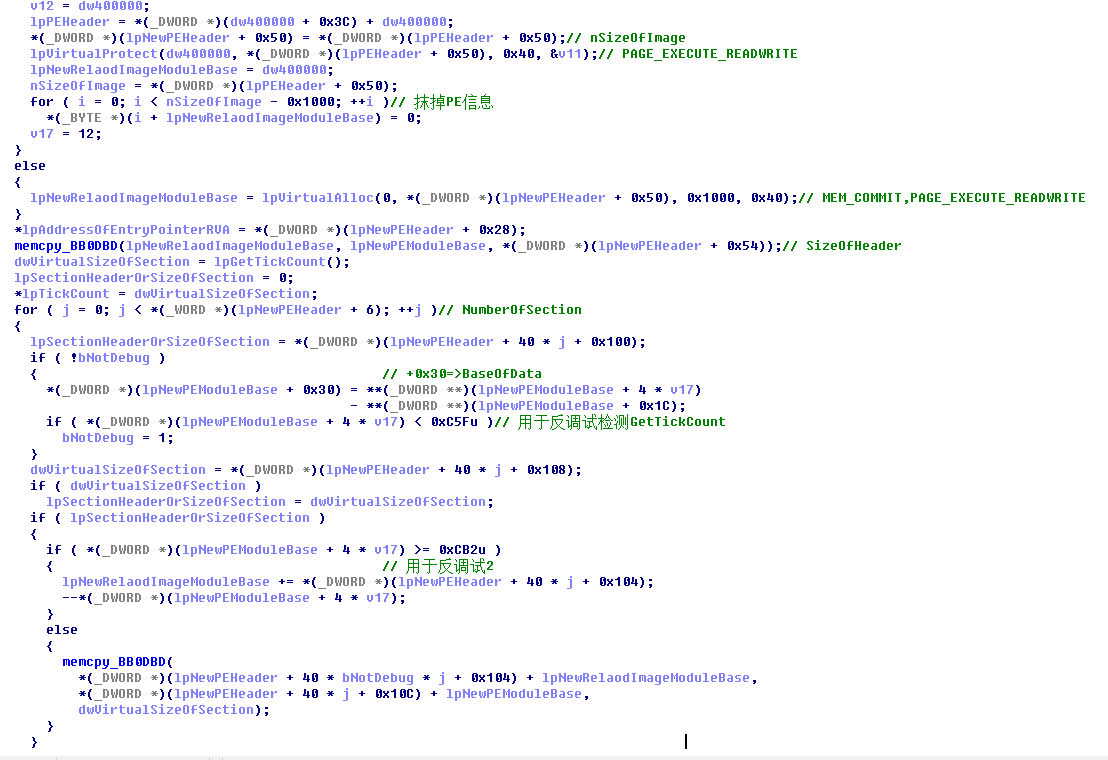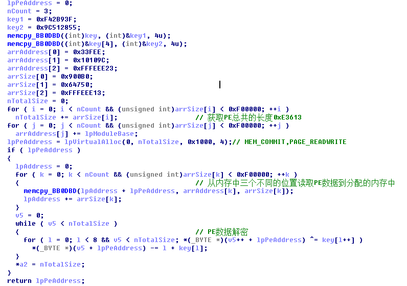 在Shellcode中,从模块的三个不同位置读取出PE数据,拼接上并解密。