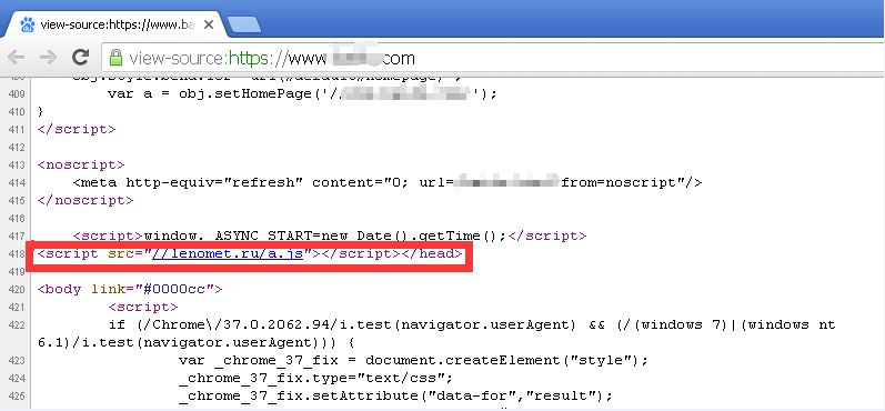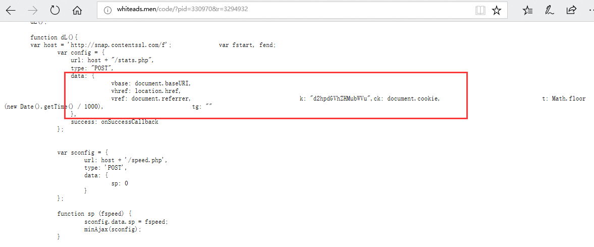 真正的窃取Cookie的恶意脚本隐藏在两次<script>间接调用中,将用户浏览网站的Cookie等信息上传至http://snap.contentssl.com/f/stats.php。