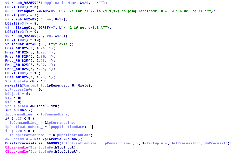 “Bigben”在执行完上述恶意操作后,会通过获取文件资源管理器explorer.exe的pid,得到其token,然后使用CreateProcessAsUser的方式,伪造成explorer.exe打开cmd.exe来进行自删除操作。