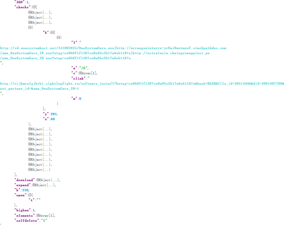 在第一次网络交互中,Bigben从上述URL中获取的是一个JSON数据,其中包括了浏览器将要打开的推广网址(url),需要搜集的用户信息类型(checks),伪装的下载文件名称(name),解密后的JSON数据如下图。