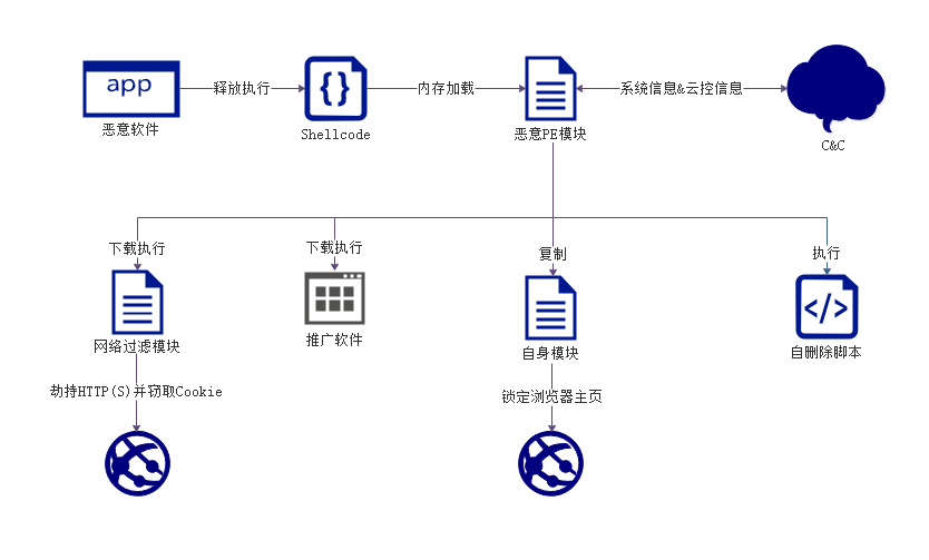 为了躲避取证和查杀,此类病毒大量使用了ShellCode和隐蔽加载技术,如果仅仅用作流氓推广,可谓是“高射炮打蚊子,大材小用”,经过安全专家进一步分析发现,该病毒通过各种绕路后,插入浏览器的恶意代码可以轻松获取各种账号和cookie信息,即便是https加密的网站也难逃此劫,严重威胁到用户的隐私安全。