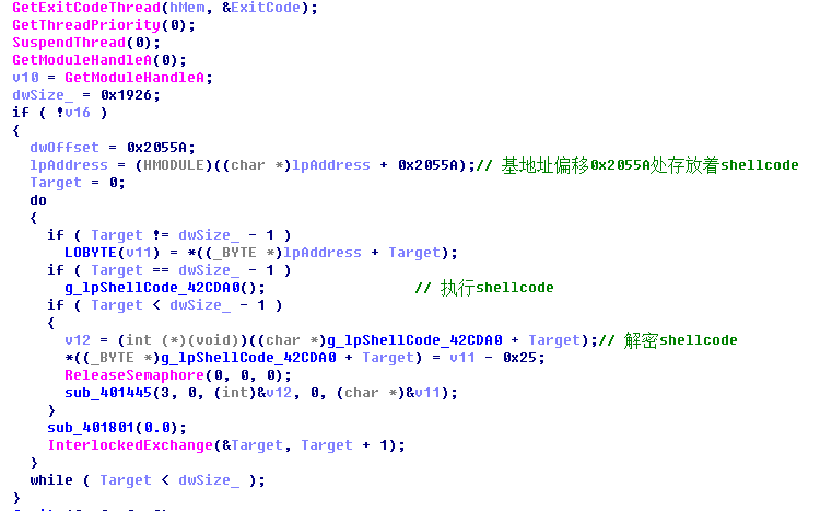 从模块基地址的偏移0x2055A处读取长度为0x1926的Shellcode,并解密执行。