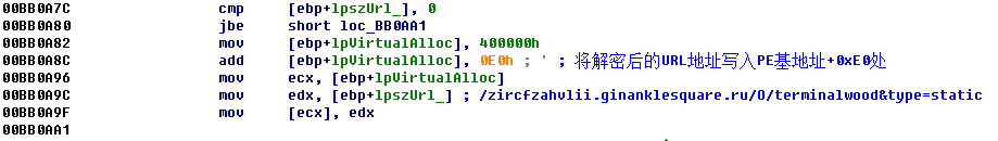 在模块基地址偏移0xE0处写入解密后的远程服务器地址,该地址将被内存加载的PE使用。