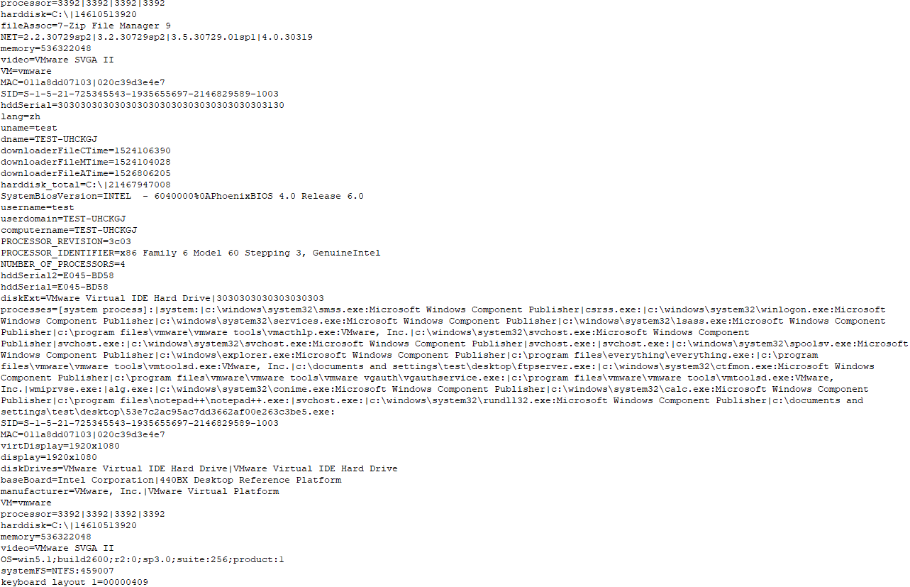 第二次网络交互会将收集的系统信息POST给C&C服务器,其中包含了用户系统的各种信息,如下图。