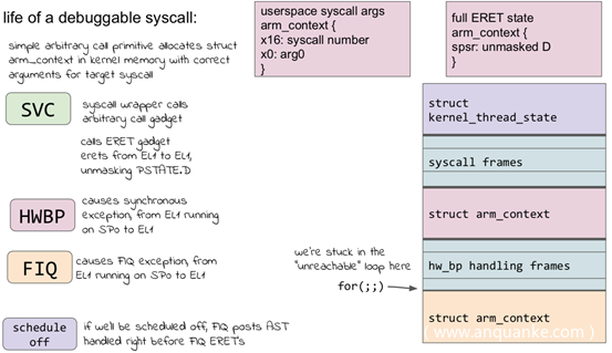因为在异常处理是会将PSTATE.D设为1,而PSTATE.D的值为1的时候硬件断点是无法生效的。通过ROP自己封装一个system call,先将PSTATE.D设为0之后再去做相应的系统调用,这时就可以触发硬件断点了。