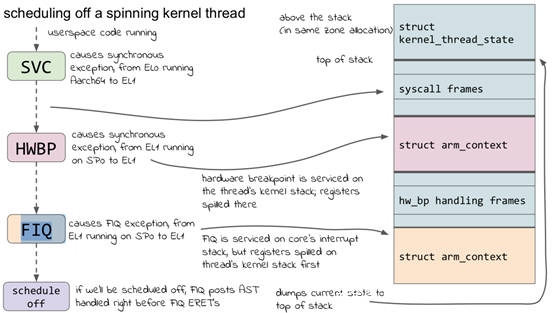 通过FIQ异常的特性,可以将硬件断点触发后陷入死循环的线程通过调度算法重新执行。