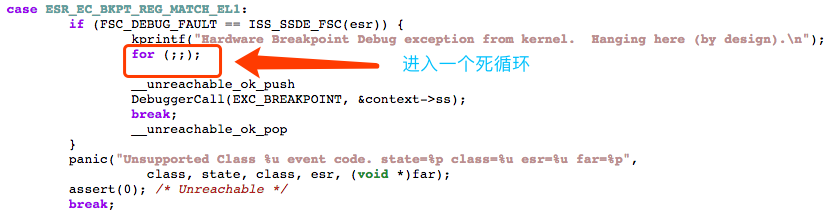 根据这一段代码可以知道,如果我们能够构建并使得一个硬件断点生效的话,将导致当前执行代码的那一颗核(core)进入一个死循环。