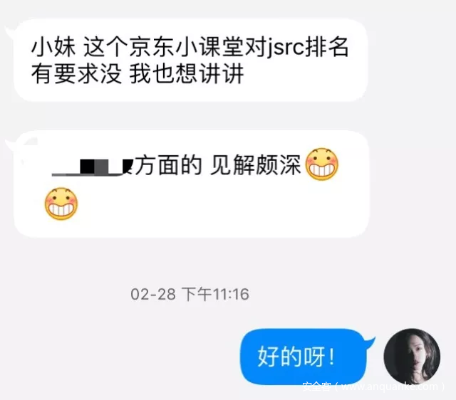京东安全小课堂连续100期不断,坚持每周分享干货,正儿八经纯技术分享,不扯犊子、不扯淡,SRC圈子里的一股清流。祝愿京东安全小课堂越办越好!——JSRC首席白帽Mr.Chou