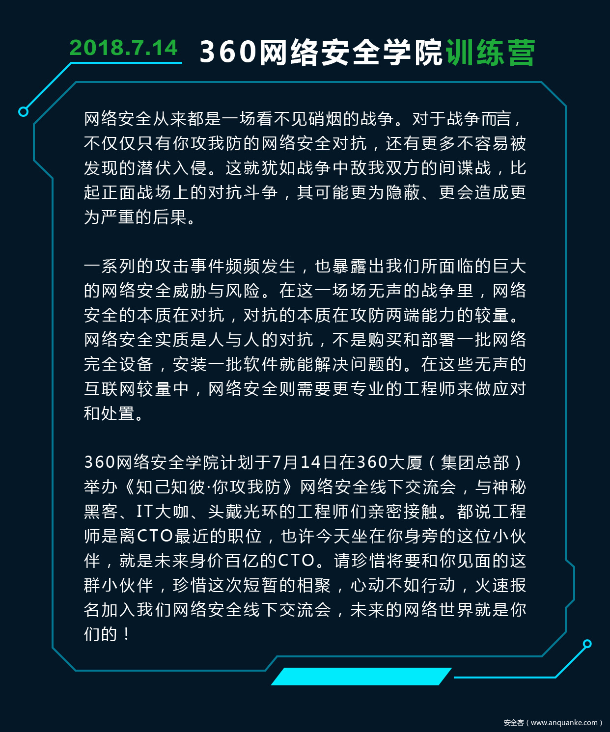 上期360网络安全学院主办的训练营活动一经发布就收到众多小伙伴咨询报名。