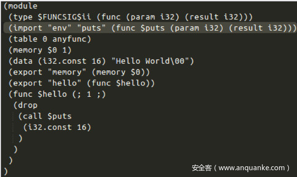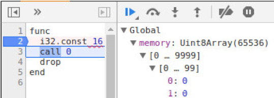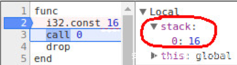 Wasm中的所有函数都被编号,编号为0的函数对应于Wasm从JavaScript导入的函数“puts”(编号为1的函数对应于“hello”函数)。因此,下一条调用0的指令实际上调用的是printf/puts函数,而堆栈中的值“16”就是它的参数。