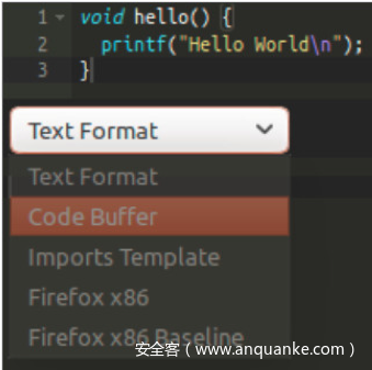 那么,我们如何定义这个缓冲区的内容(Wasm代码)呢?在WasmFiddler中,单击源代码下面的下拉菜单(图1中的“Text Format”),然后选择“Code Buffer”。