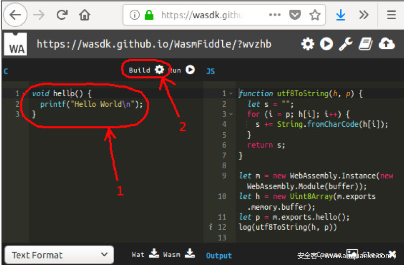 注意:如果你只是得到一个空数组(“var wasmCode = new Uint8Array([null]);”),那么你应该是忘记了先编译源代码。在这种情况下,点击Build,再试一次。