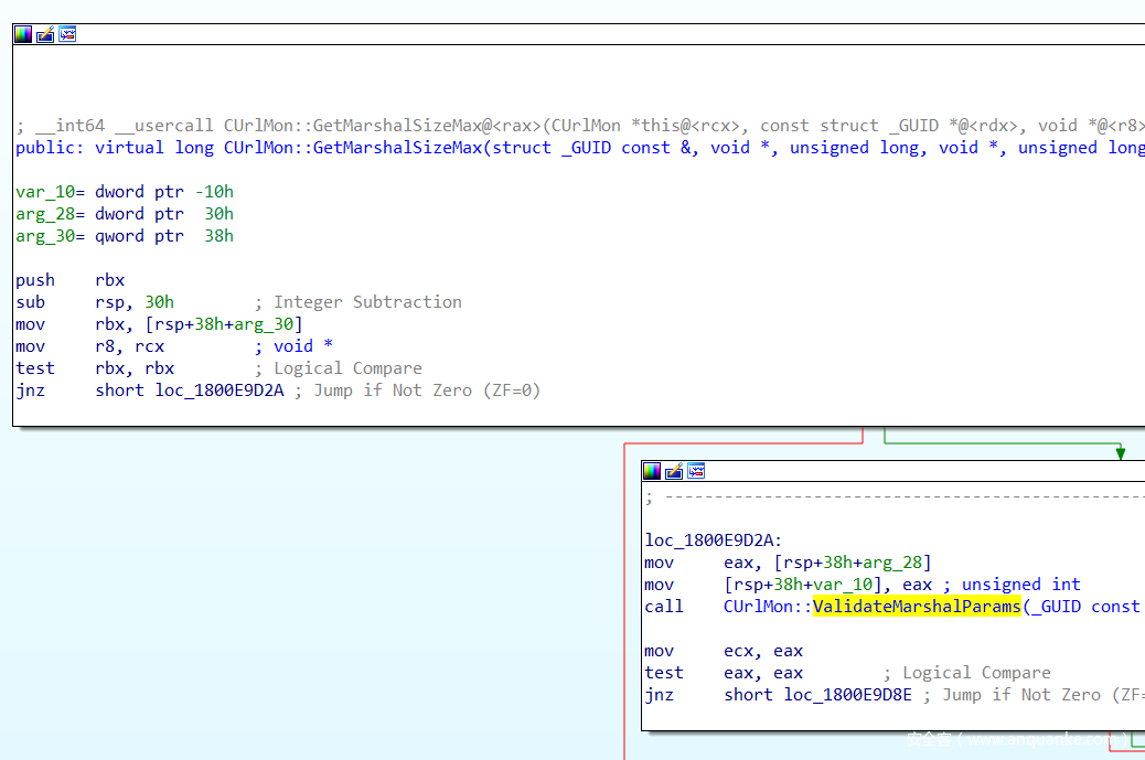 因此,我们在IDA PRO中查看,关于CUrlMon::GetMarshalSizeMax() 的实现。如下图,我们看到,在一开始就对CUrlMon::ValidateMarshalParams()这个函数进行调用。