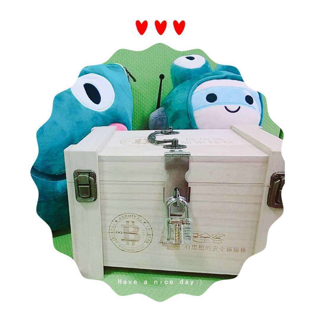 最后还要隆重介绍我们此次安全客赠送给各位合作商的定制礼物:区块链加密钱包,高大上的复古盒,加上特制的锁,里面是四个金光闪闪的币,相信大家肯定很心动,此次也有1位同学抽到哦!不知道是哪位同学这么幸运!