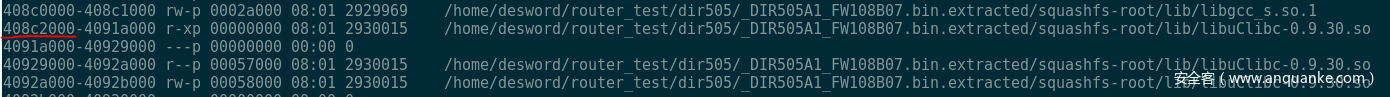 可以发现载入的地址是0x408cbf90,但是这个不是基地址,而是载入了libc.so.0的入口地址,基地址就要减去其入口地址。执行下面的命令: