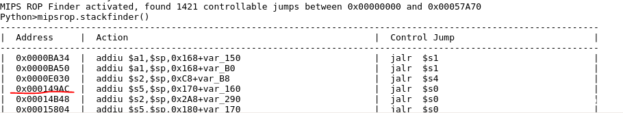 利用IDA脚本 mipsrop.stackfinder(),既可以找到。