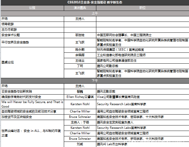 CSS邀请到包括中国互联网协会理事长、中国工程院院士邬贺铨,中国科学院自动化研究所复杂系统管理与控制国家重点实验室主任王飞跃,工业和信息化部电信研究院总工程师余晓晖,国家电网公司信息通信部主任王继业,国际知名安全技术专家、密码学家Bruce Schneier,通用公司自动驾驶安全领域首席工程师Charlie Miller、Security Research Labs的首席科学家Karsten Nohl,以及腾讯公司副总裁丁珂。