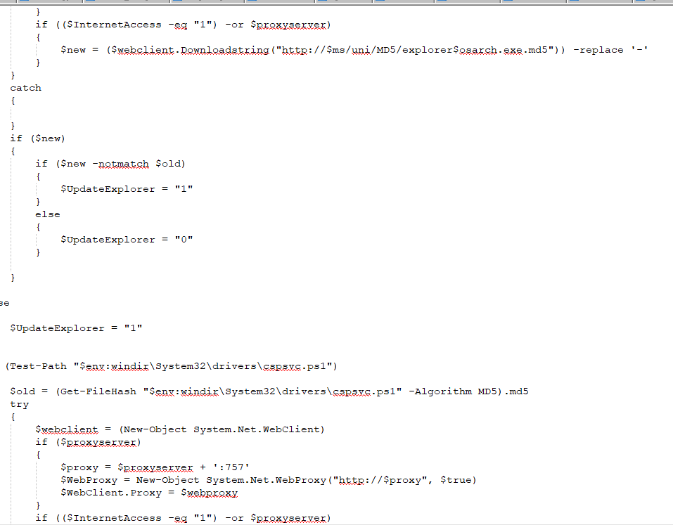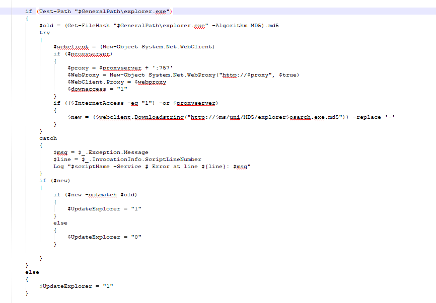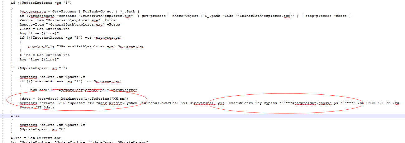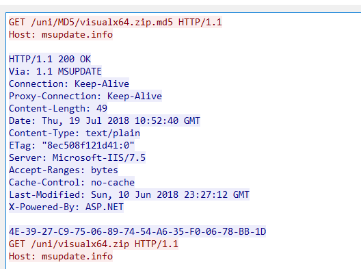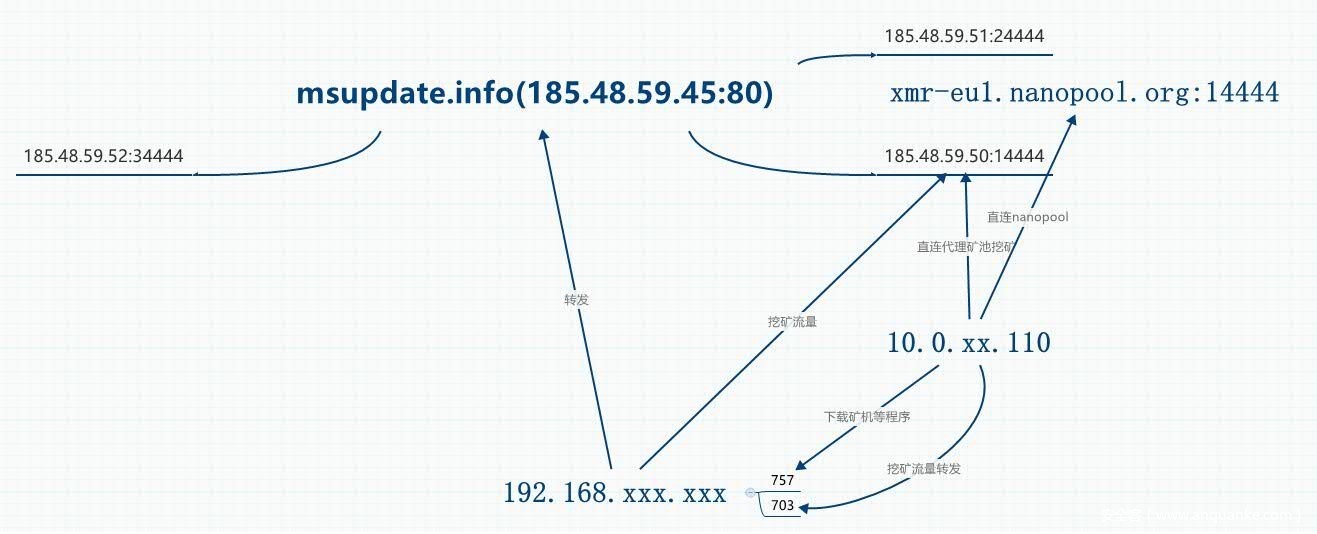 访问http://msupdate.info/uni/MD5/explorerx64.exe.md5,获取最新矿机、木马ps1脚本MD5值,然后对比本地矿机、木马ps1脚本MD5值决定是否更新,若有更新,则创建任务计划”update”将文件下载到c:windowsfontstemp,然后覆盖旧文件。