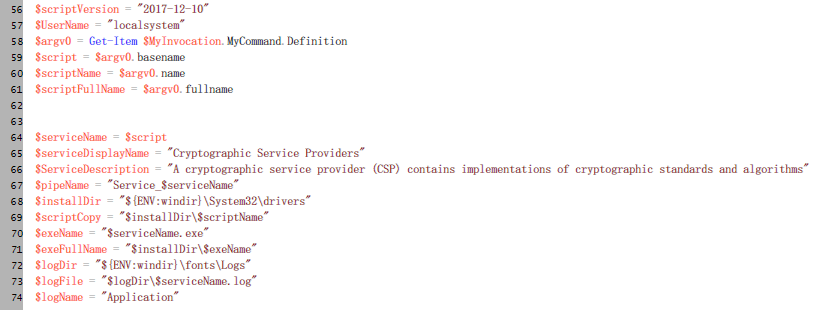 给脚本基本变量赋值,脚本名、脚本路径、服务名等。输出木马版本为2017-12-10