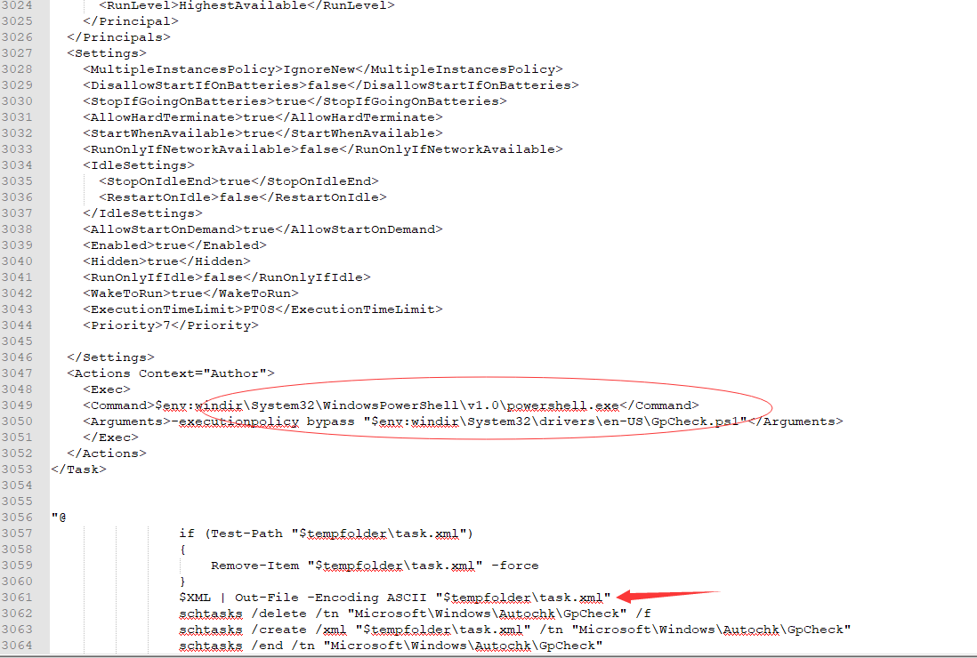22、写入xml文件到c:windowsfonttemptask.xml,该文件作用是利用任务计划创建gpcheck,调用gpcheck.ps1