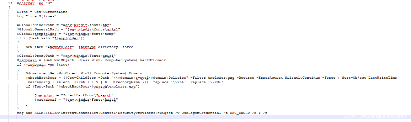 14、如果认定反木马软件不存在,设定矿机路径为c:windowsfontsttf,常用路径为c:windowsfontsarial,临时路径为c:windowsfontstemp。如果有域,则检查域内后门是否存在$domainsysvol$domainPolicies,接着设置注册表,将WDigest身份认证缓存在内存。