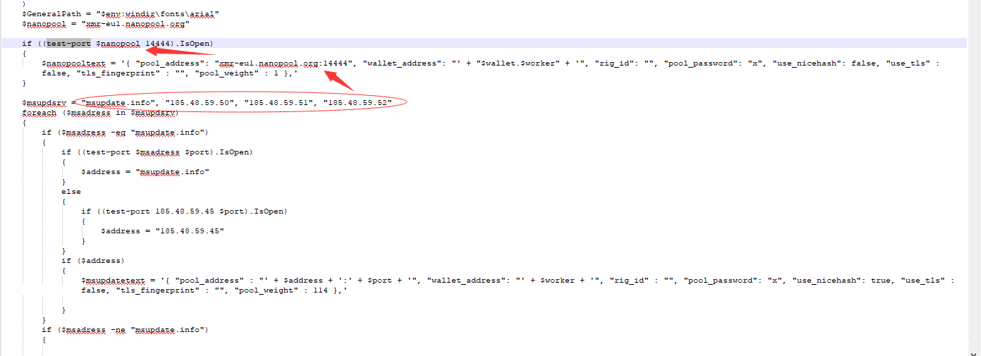 5、尝试从c:windowsfontsarialconfig.xml配置文件中读取配置,若配置文件不存在,尝试从c:windowsSoftwareDistributionconfig.xml复制过来,若都不存在,则使用下列地址配置挖矿账户和矿池。