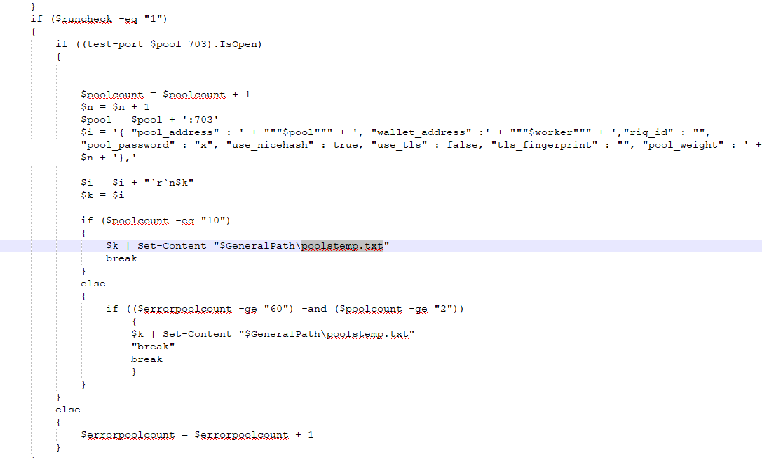 20、测试连接矿池703端口,poolstemp.txt来源于pools.txt,根据配置和矿池连通性,从中选取一条配置,创建配置信息$GeneralPathconfig.json。