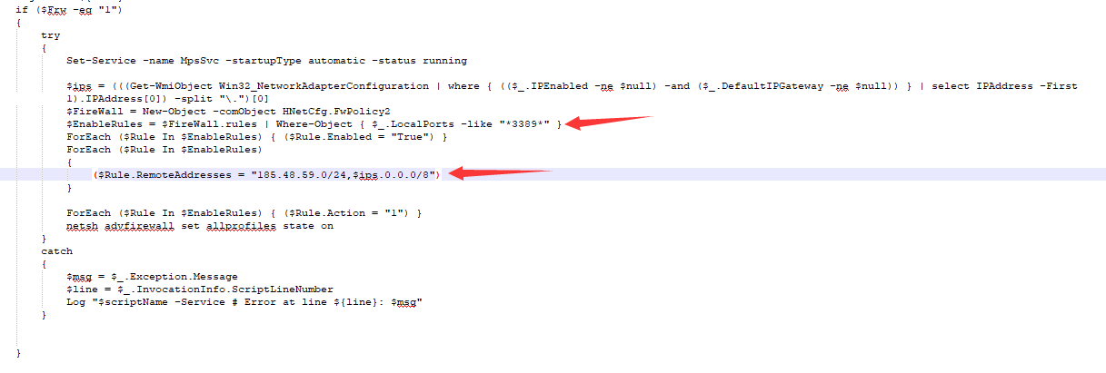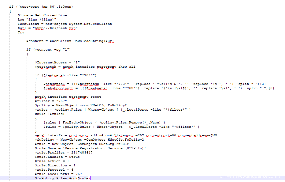 21、接着再释放一段加密代码,到c:windowssystem32driversen-USGpCheck.ps1,同上面方法,代码中的iex改为echo,解密代码,发现其作用是维护更新文件、端口转发、防火墙策略、测试矿池连通性等。