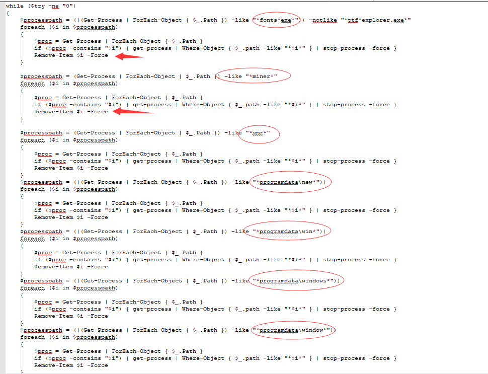 2、排除掉自己的挖矿进程外,干掉挖矿竞争对手,即带有关键字xmr、miner、programdatanew、programdatawin、programdataWindow、programdataWindows等进程。
