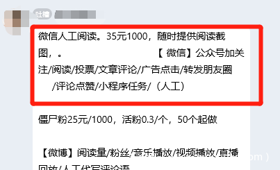 潜入其中一个群后了解了一下黑产市场的基本定价,大概都在25-40元左右1000个阅读量。