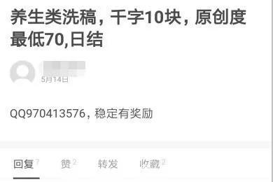 征稿信息中内容多以二次洗稿为主,对专业没有任何要求,稿费水平不高,基本在千字100元以内,这样写出来的“养生科普文”是否能够做到“科普“我们也就不得而知了…
