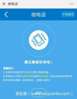 于是我尝试着拨打了隔壁magiccc的电话,出现了下面让我们注意接听来电的提示,并出现“接通电话后即可与对方进行通话连接”等所谓的“温馨提示”…此时我的手机并未出现任何接通成功的页面,相反进来了一个陌生号码,接通后语音告诉我“对方暂时无法接通”。