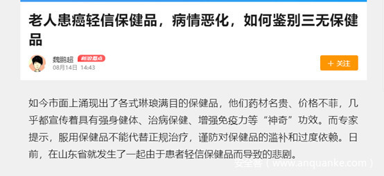 顶着“健康”的名号却严重影响着我们的健康和生活,尤其是目前此类“健康养生”文章的主要受众是中老年人,在以熟人关系建立的朋友圈中肆意传播,其带来的危害和损失难以估量…