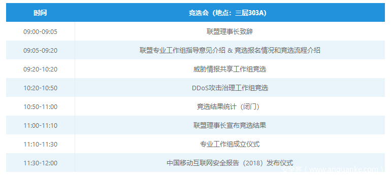 | 上午 | 应急响应分论坛 | 网络空间态势感知分论坛 | 网络攻击与溯源分论坛 | 威胁情报分论坛 | “中国互联网网络安全威胁治理联盟”专业工作组竞选 | 网络安全技术对抗赛 |