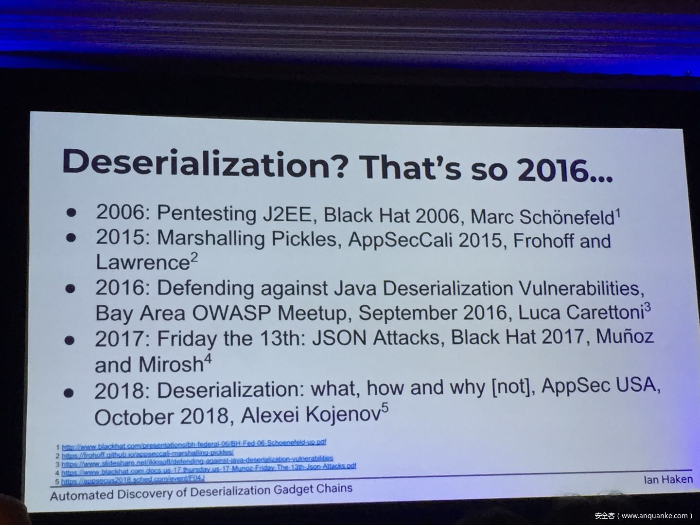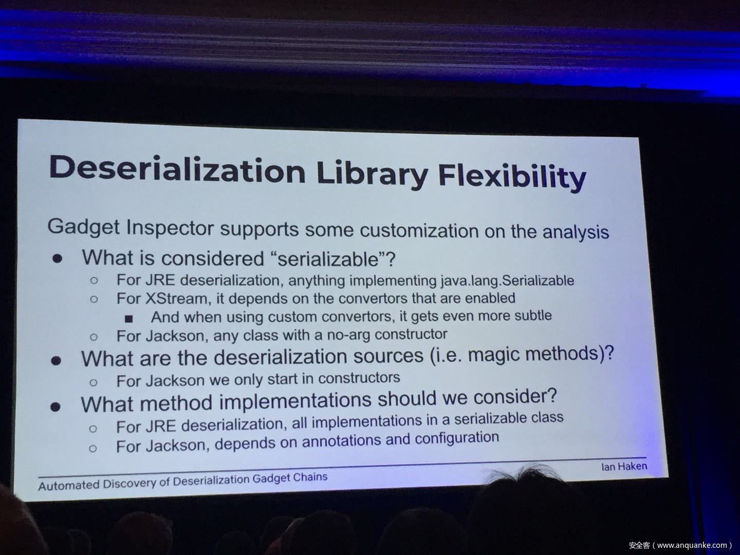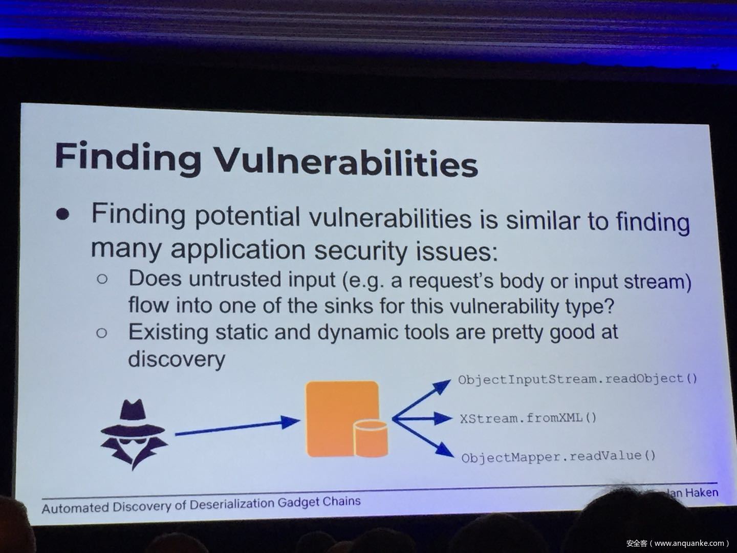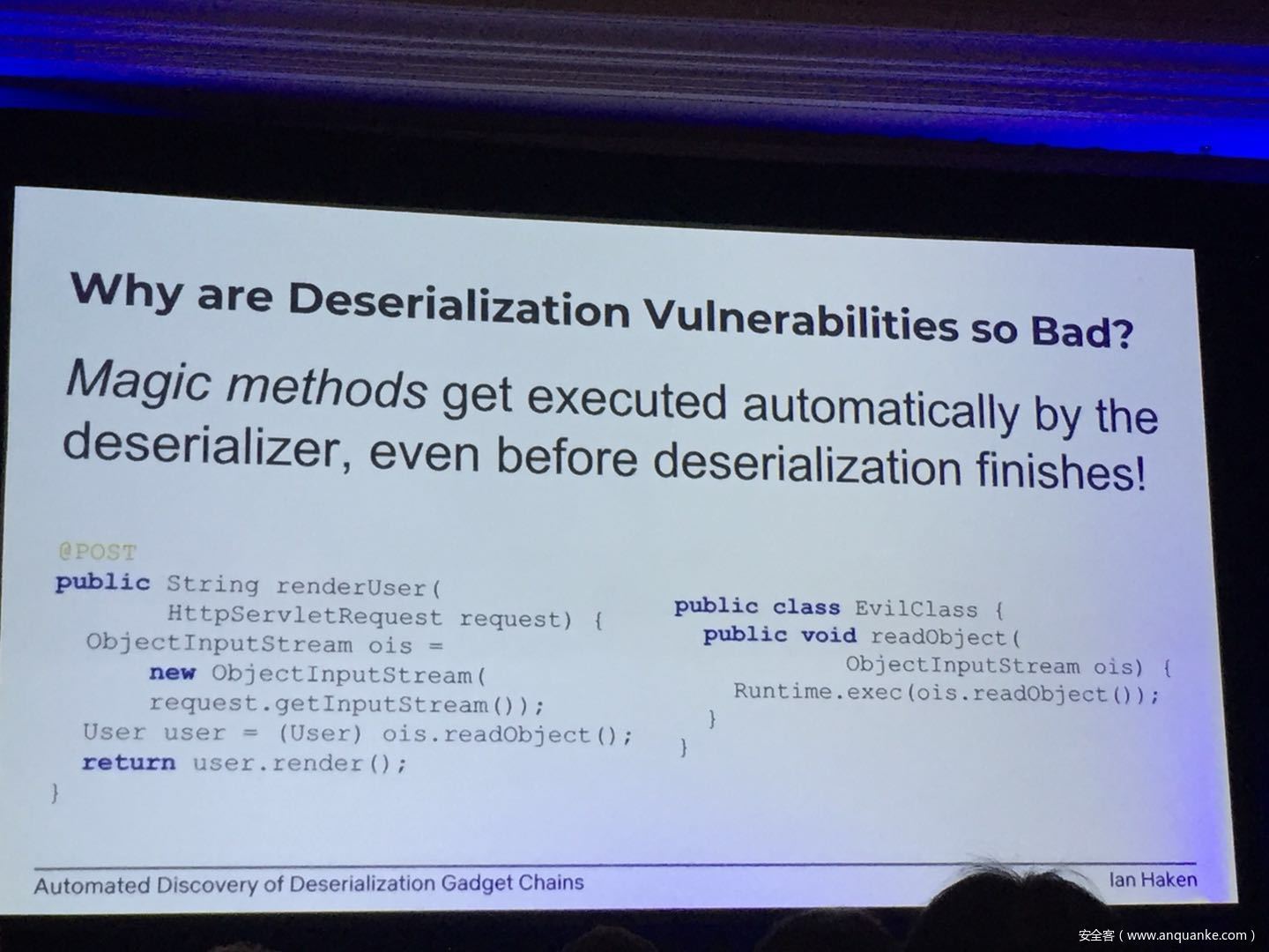 Although vulnerabilities stemming from the deserialization of untrusted data have been understood for many years, unsafe deserialization continues to be a vulnerability class that isn’t going away. Attention on Java deserialization vulnerabilities skyrocketed in 2015 when Frohoff and Lawrence published an RCE gadget chain in the Apache Commons library and as recently as last year’s Black Hat, Muñoz and Miroshis presented a survey of dangerous JSON deserialization libraries. While much research and automated detection technology has so far focused on the discovery of vulnerable entry points (i.e. code that deserializes untrusted data), finding a “gadget chain” to actually make the vulnerability exploitable has thus far been a largely manual exercise. In this talk, I present a new technique for the automated discovery of deserialization gadget chains in Java, allowing defensive teams to quickly identify the significance of a deserialization vulnerability and allowing penetration testers to quickly develop working exploits. At the conclusion, I will also be releasing a FOSS toolkit which utilizes this methodology and has been used to successfully develop many deserialization exploits in both internal applications and open source projects.