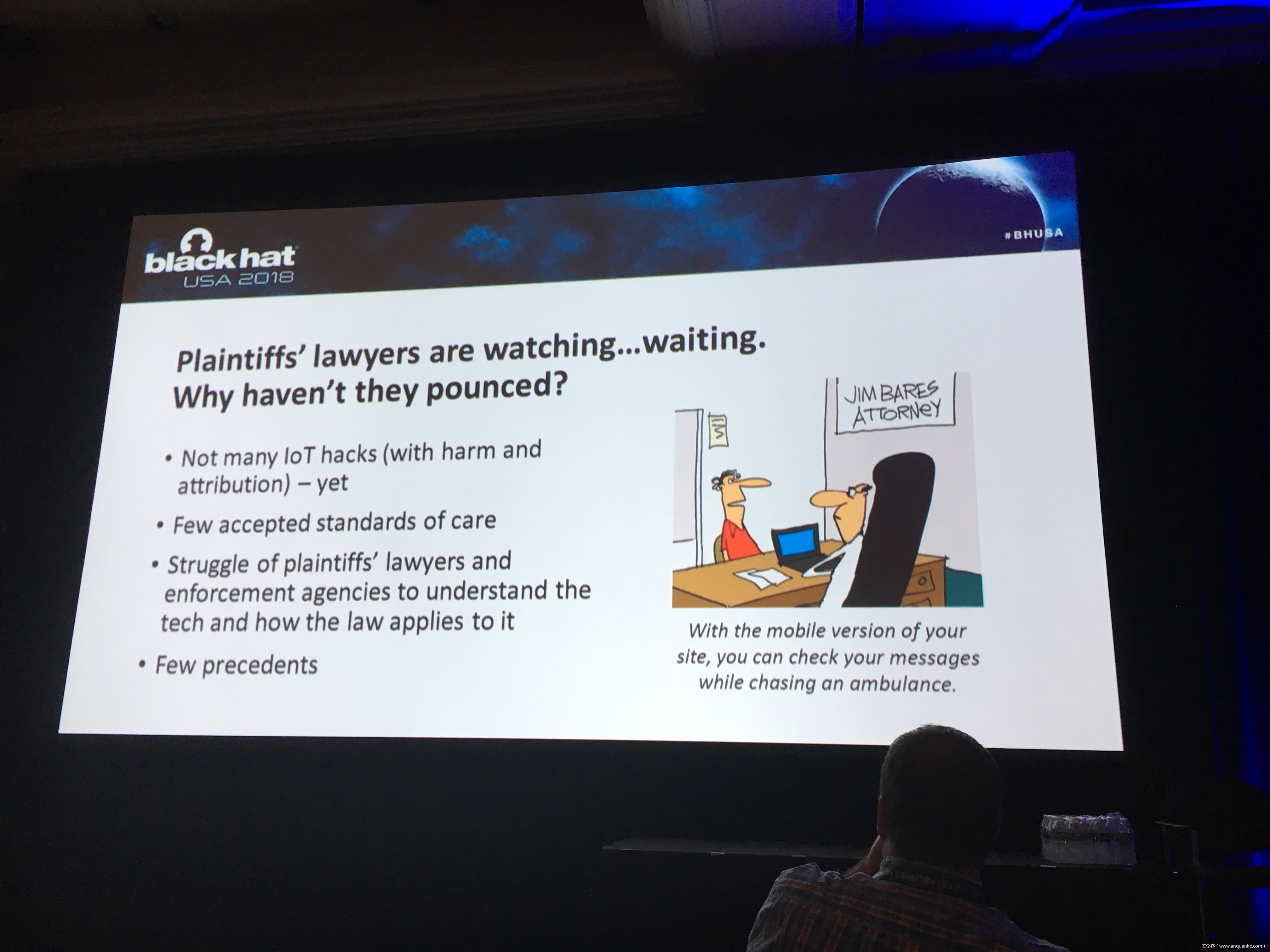 There has been much discussion of “software liability,” and whether new laws are needed to encourage or require safer software. My presentation will discuss how — regardless of whether new laws are passed — a tidal wave of litigation over defective IoT cybersecurity is just over the horizon.
