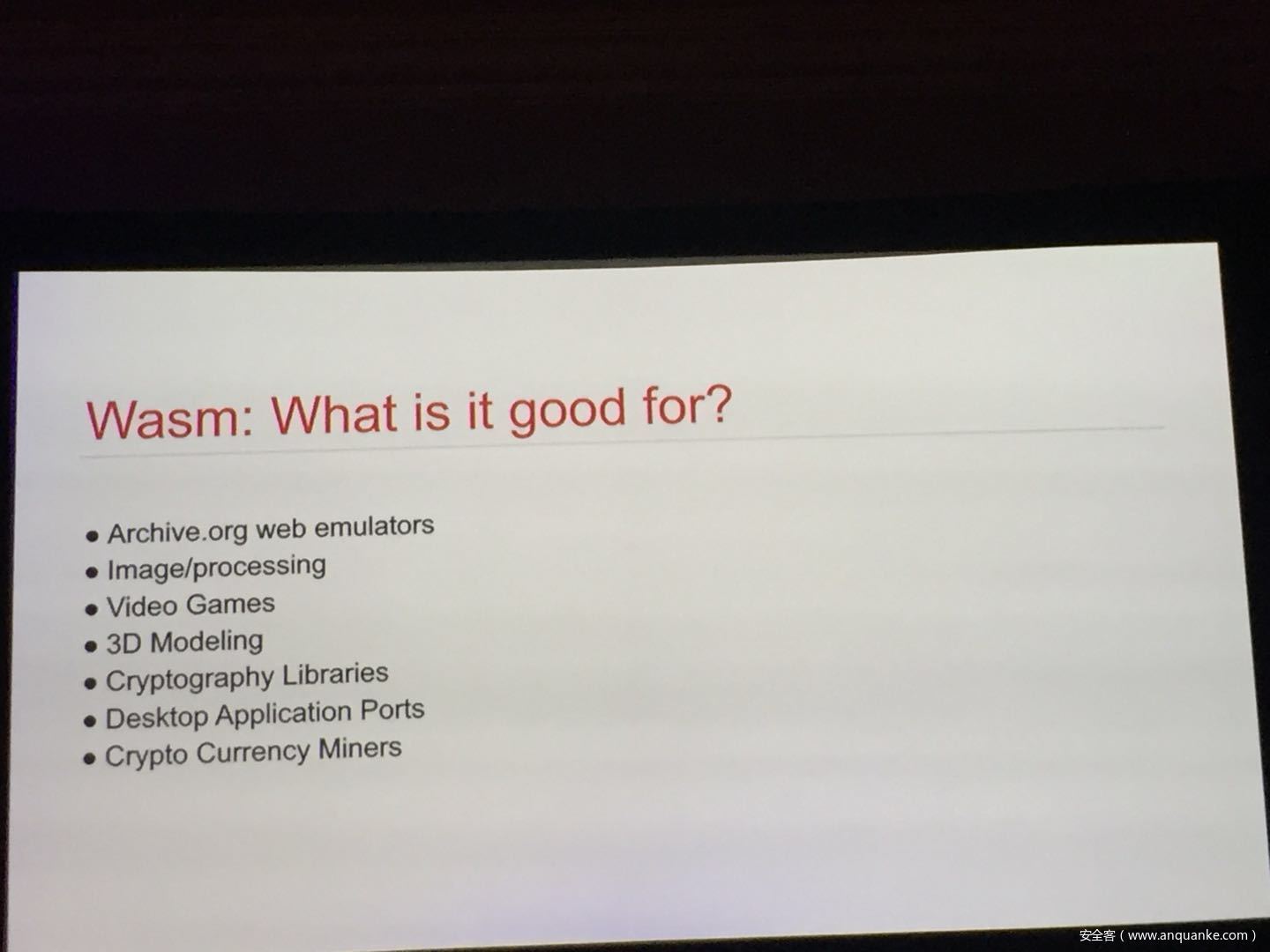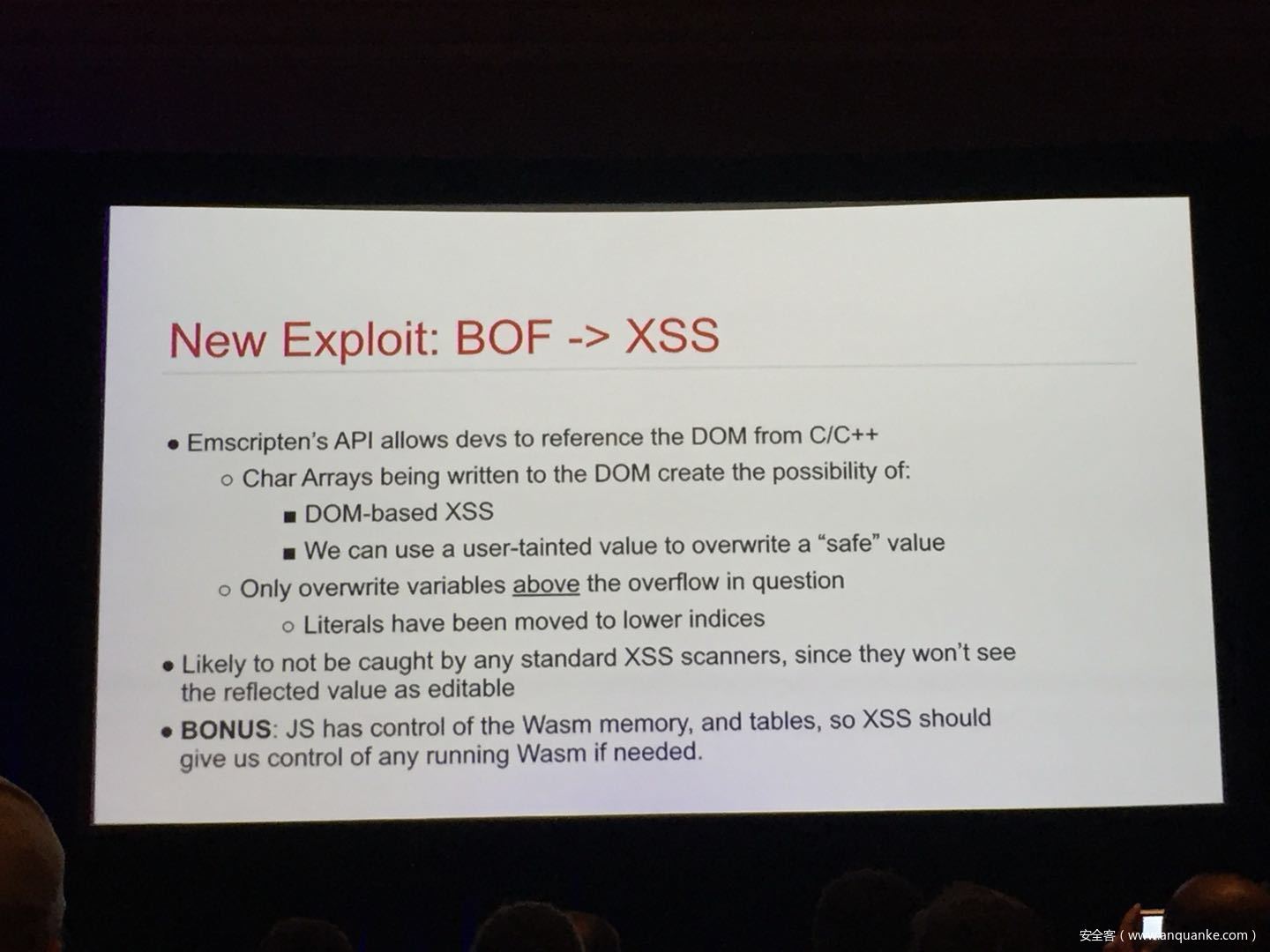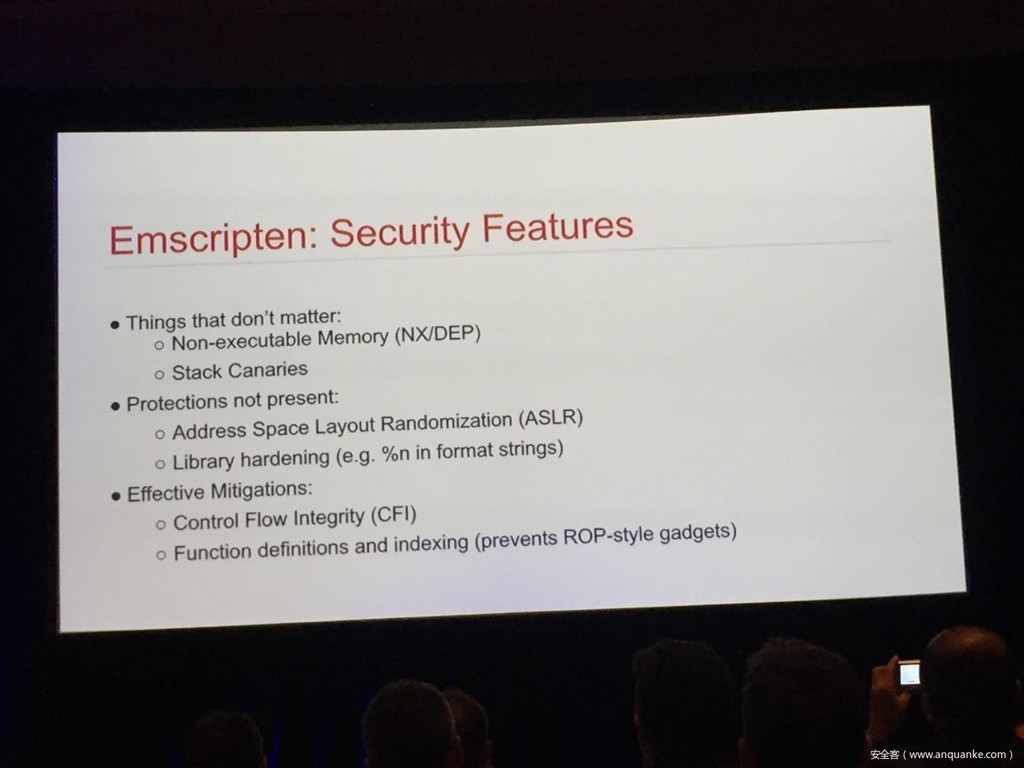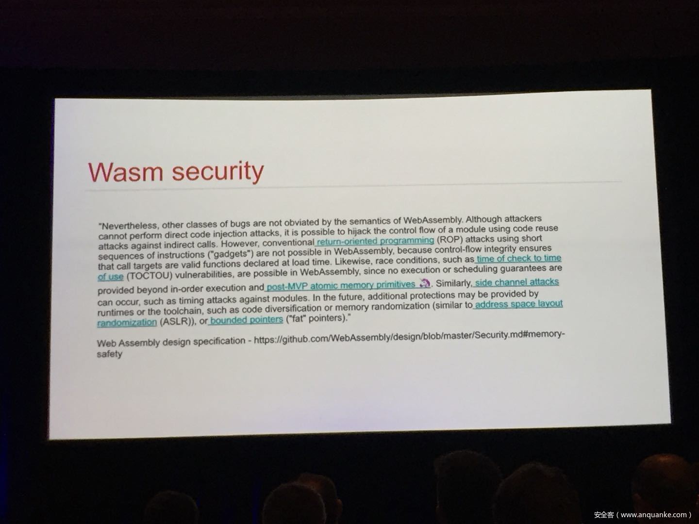 WebAssembly (WASM) is a new technology being developed by the major browser vendors through the W3C. A direct descendent of NaCl and Asm.js, the idea is to allow web developers to run native (e.g. C/C++) code in a web page at near-native performance. WASM is already widely supported in the latest versions of all major browsers, and new use case examples are constantly popping up in the wild. Notable examples include 3D model rendering, interface design, visual data processing, and video games. Beyond providing significant performance benefits to developers, WebAssembly is also touted as being exceptionally secure. Developers claim that buffer overflows will be an impossibility, as any attempted access to out-of-bounds memory will be caught by a Javascript error. Their documentation claims that control flow integrity is enforced implicitly and that “common mitigations such as data execution prevention (DEP) and stack smashing protection (SSP) are not needed by WebAssembly programs.” However, the documentation also outlines several possible vectors of attacks, including race conditions, code reuse attacks, and side channel attacks.
