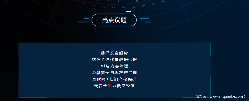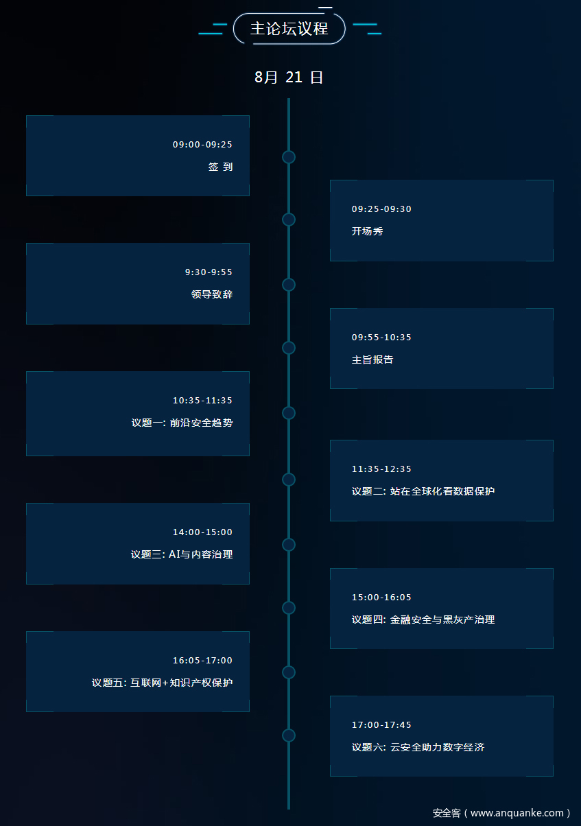 作为国内安全领域的顶级会议,8月21日峰会主论坛精心设置了六大精彩议题,包括“前沿安全趋势”、“全球化视角看数据保护”、“AI与内容治理”、“金融安全与黑灰产治理”、“互联网+知识产权保护”和“云安全助力数字经济”等。