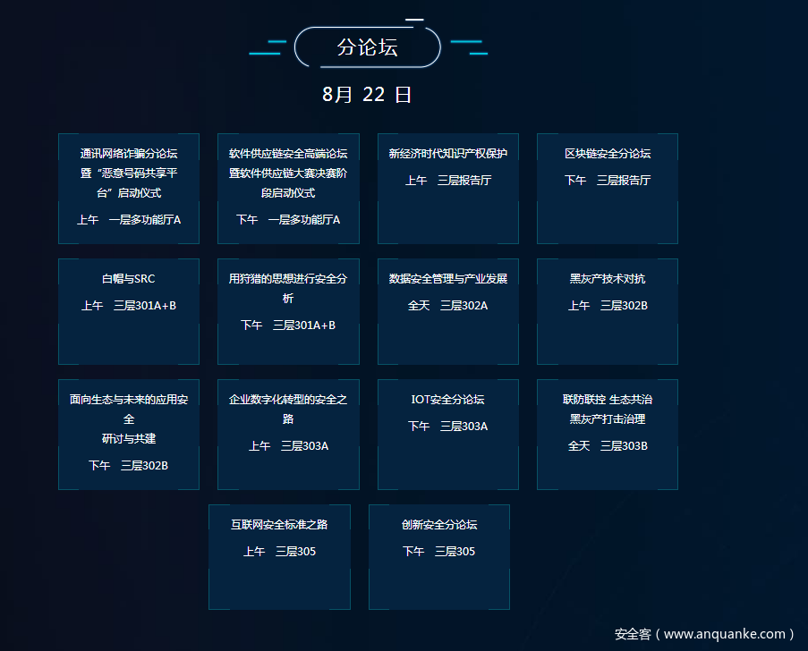 8月22日峰会第二天,还有14个分论坛将陆续召开,包括通讯网络诈骗治理、软件供应链安全、区块链安全、白帽与SRC、数据安全管理与产业发展、黑灰产技术对抗、应用安全研讨与公建、企业数字化转型安全、IoT安全、黑灰产打击治理、互联网安全标准以及创新安全等议题。