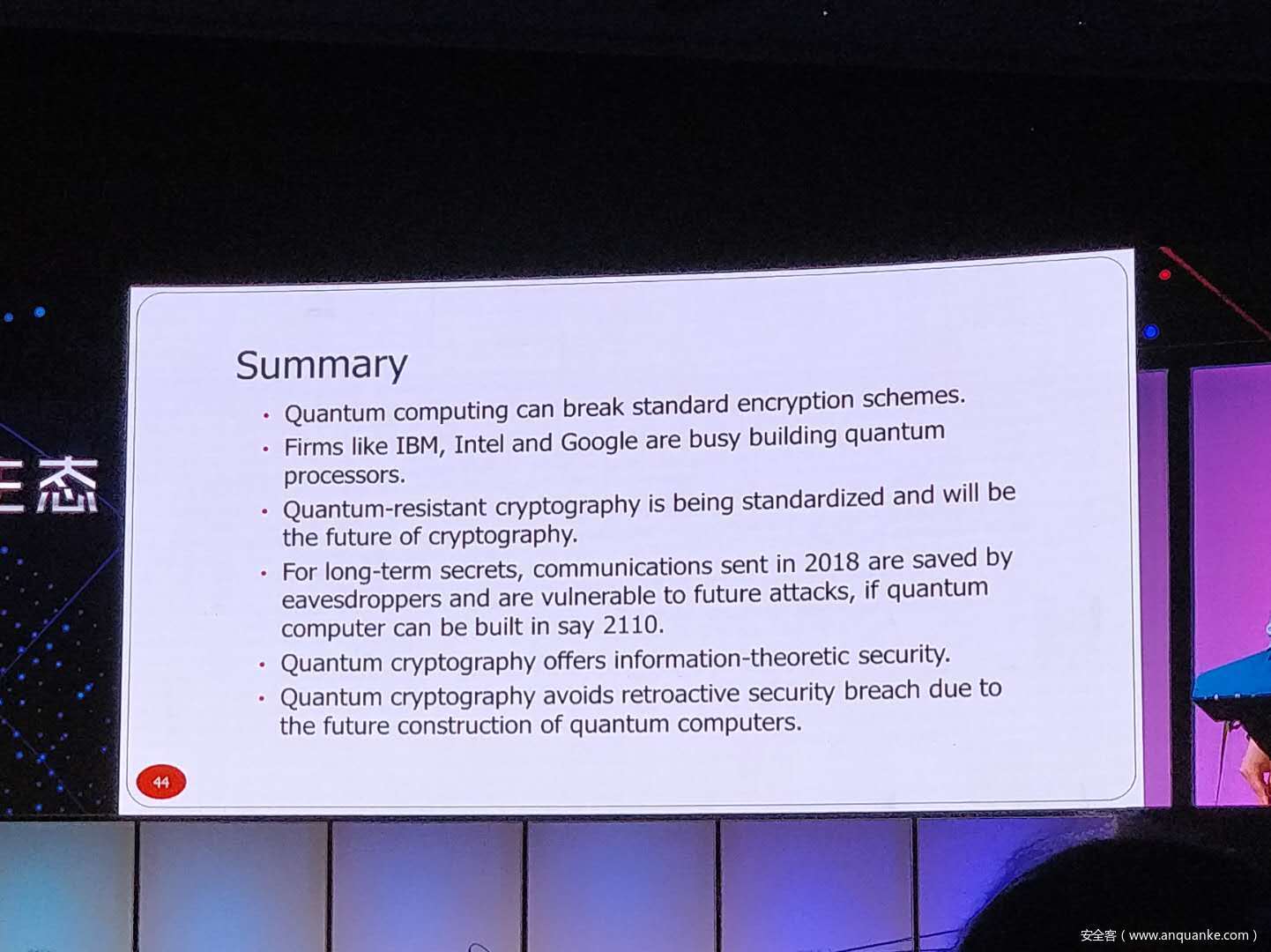 之后由Hoi-Kwong Lo和Dawn Song带来了关于前沿安全趋势的议题分享,Hoi-Kwong Lo是多伦多大学电子与计算机工程教授,同时也是量子通信先驱。他首先介绍了量子计算机的发展历史,随后又提出了对于量子网络的构想思考以及对于量子通信的优劣分析。